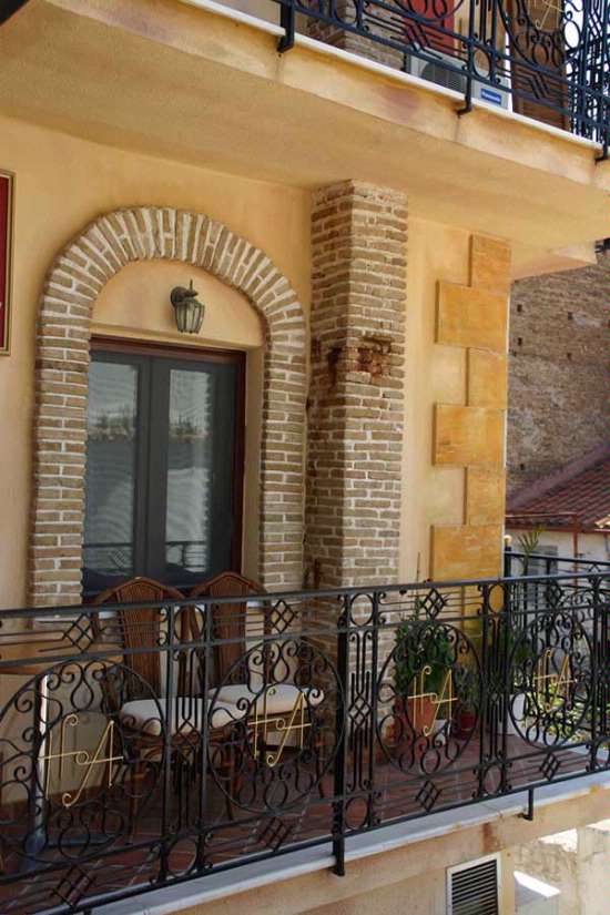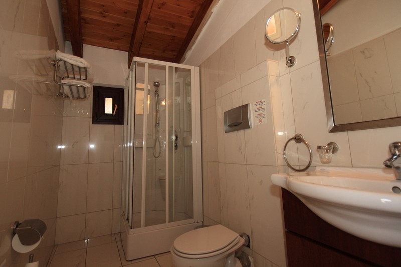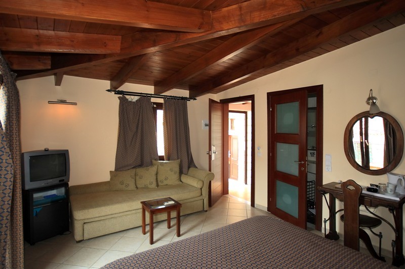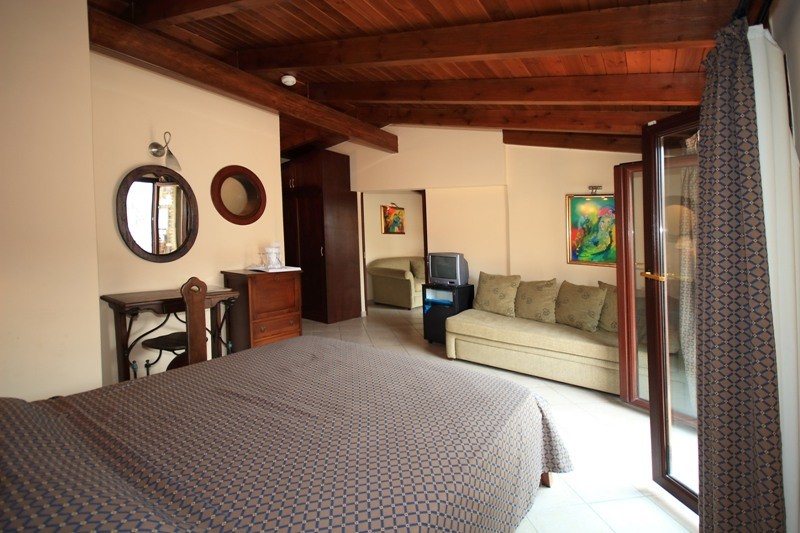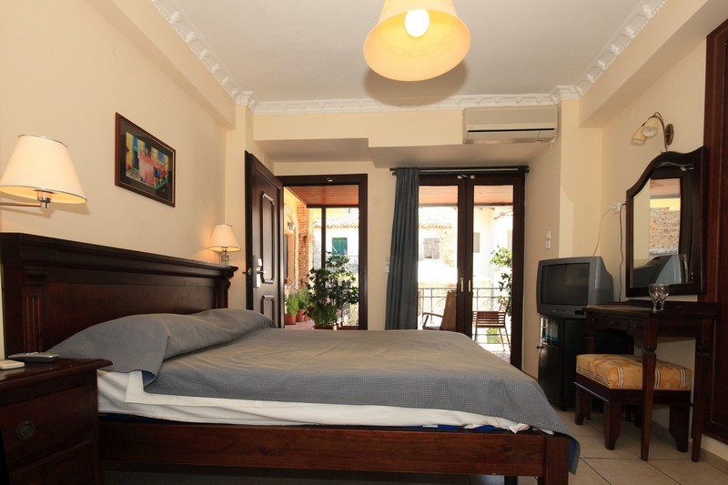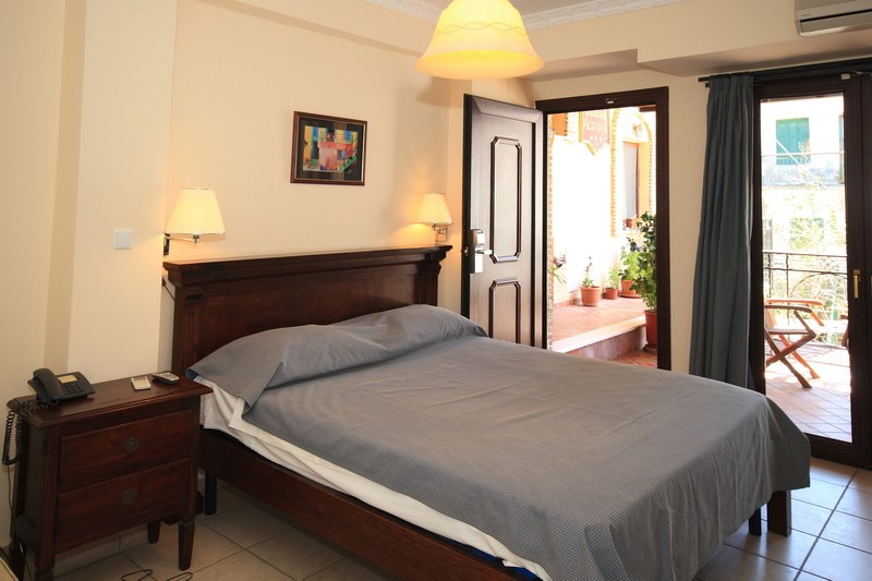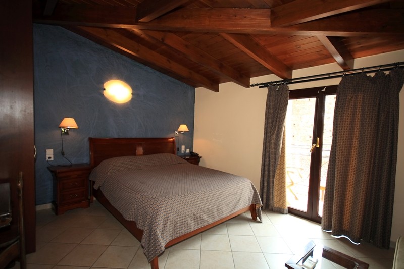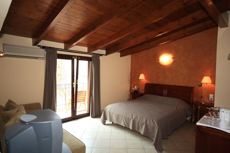 The rooms are decorated in cool shades of cream and white which blend harmoniously with the chocolate brown wood of the handmade furniture imported from Pisa in Italy. Luxury has not been neglected in any way, from the hydro-massaging shower rooms to the air-conditioning. Each room has a balcony, with comfortable wooden furniture, which either looks out to the Castello terrace or the street below and some offer partial views of the 14th century Venetian castle above the town.