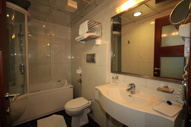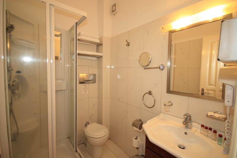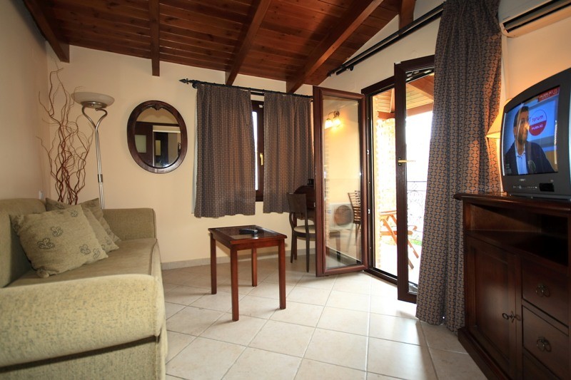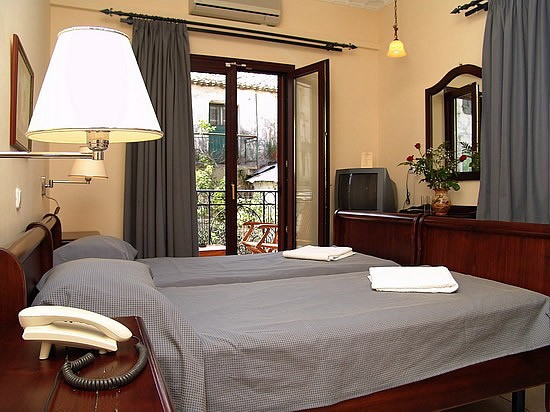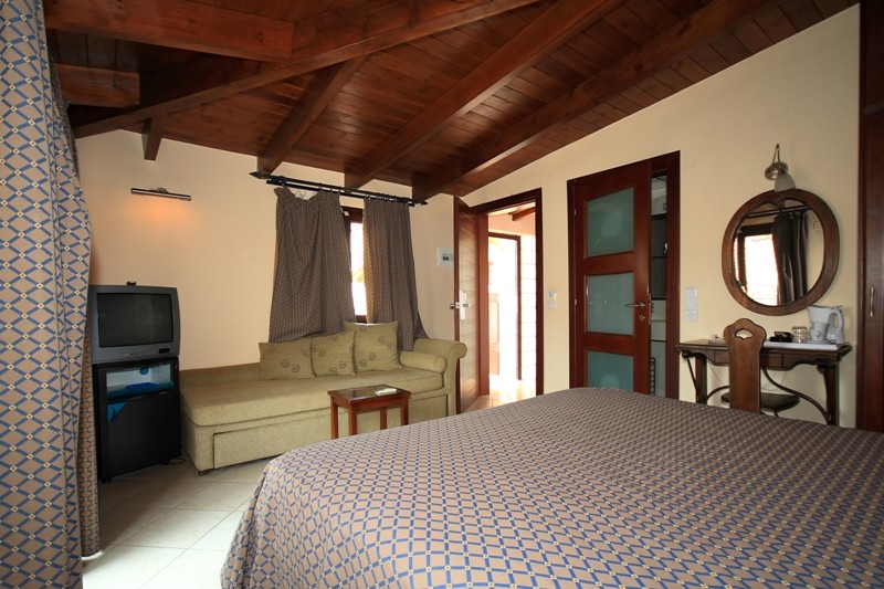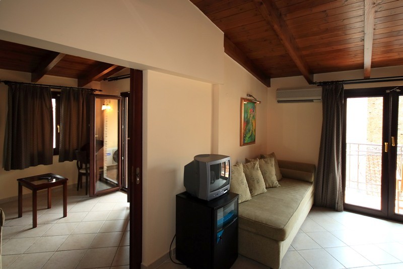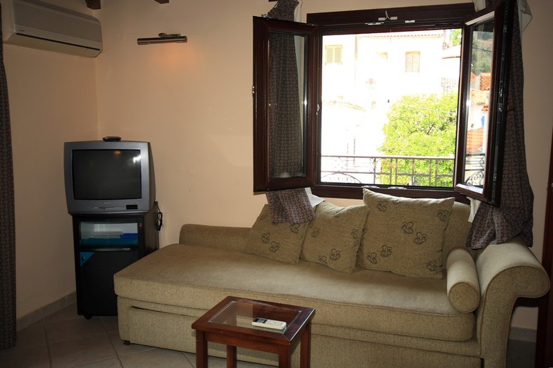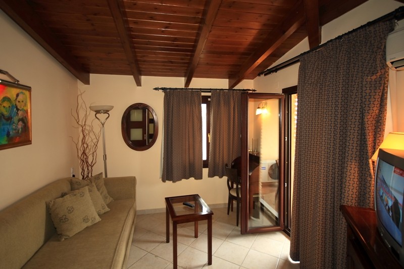 The rooms are decorated in cool shades of cream and white which blend harmoniously with the chocolate brown wood of the handmade furniture imported from Pisa in Italy. Luxury has not been neglected in any way, from the hydro-massaging shower rooms to the air-conditioning. Each room has a balcony, with comfortable wooden furniture, which either looks out to the Castello terrace or the street below and some offer partial views of the 14th century Venetian castle above the town.