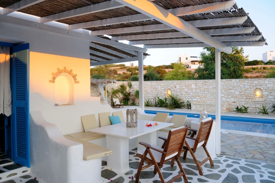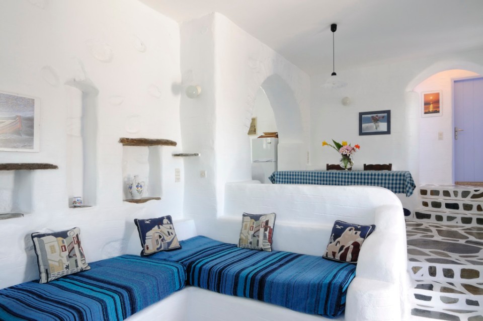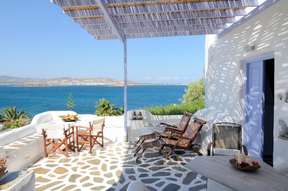 The lovely Agia Irini Villas situated on Agia Irini Bay on Paros Island are a collection of nine fully-detached classic Cycladic-styled houses in a peaceful garden setting overlooking the sea. Each of the houses can accommodate 4-6 people and they are only metres from the beach — and they all boast stunning views of the Aegean Sea, the nearby islands and spectacular sunset panoramas.