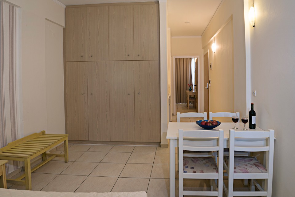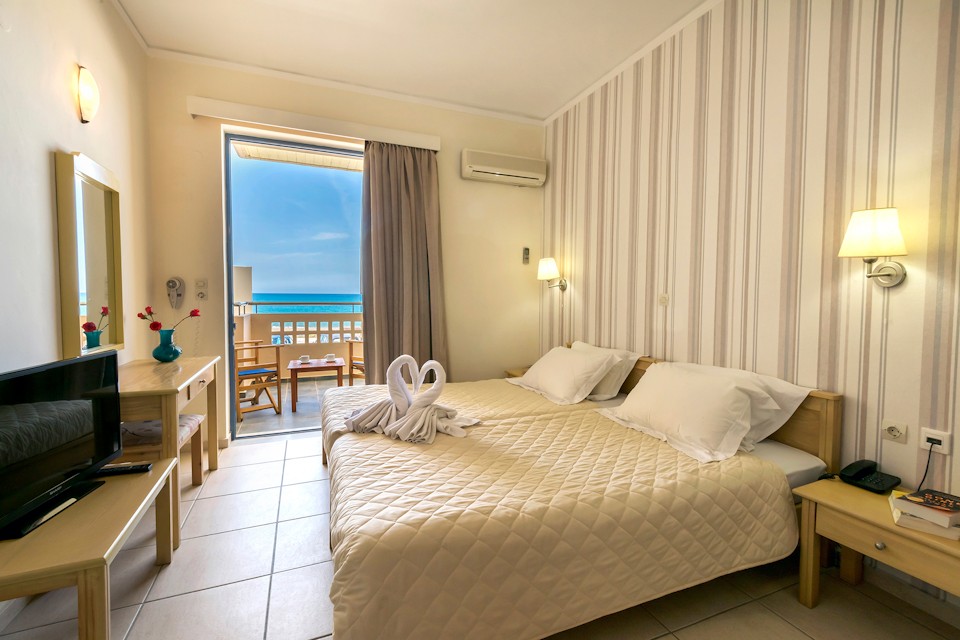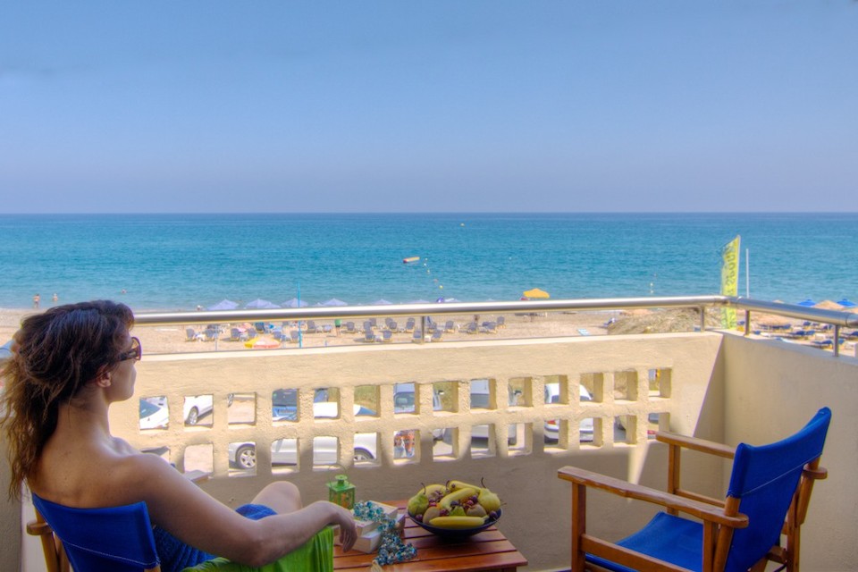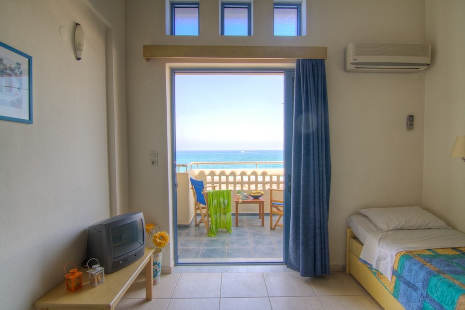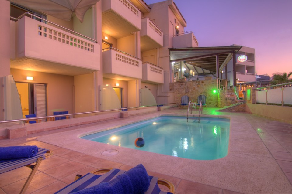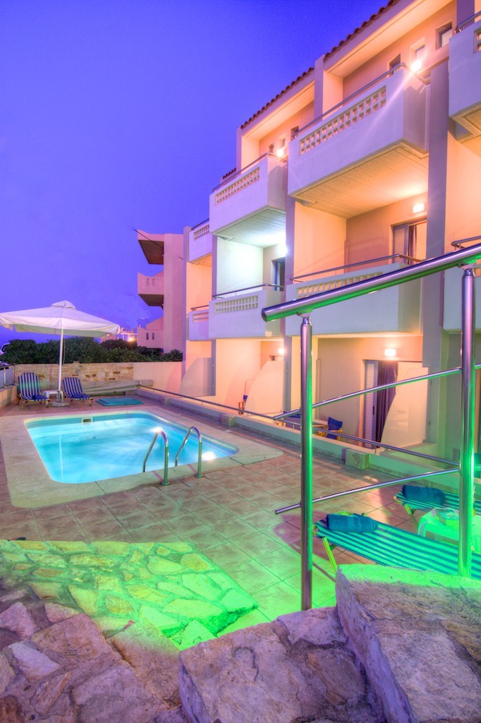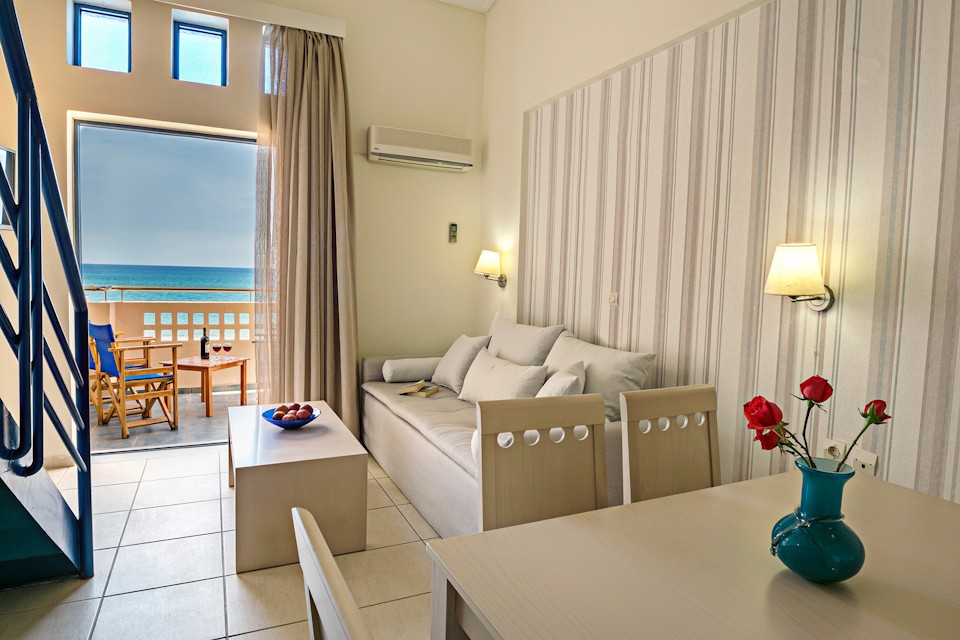 Esperia Beach Apartments & Suites is located right on the famous beach of Rethymno town on Crete, most of our apartments are sea view with big balconyes, private bath and showers and they all are full furnished with kitchen,a/c,flat tv, e.t.c. There is a mini market, reception, lift to all floors, Bar and Snack bar, Garden and a swimming pool. Our Beach front has a orginised service with sun beds and umbrellas and sea sports. Our property is ideal for those who like to walk, as it is only 30 minutes walk in to the center old town of Rethymno. Taxi rank is right outside from the hotel and bus stop is only around the corner.