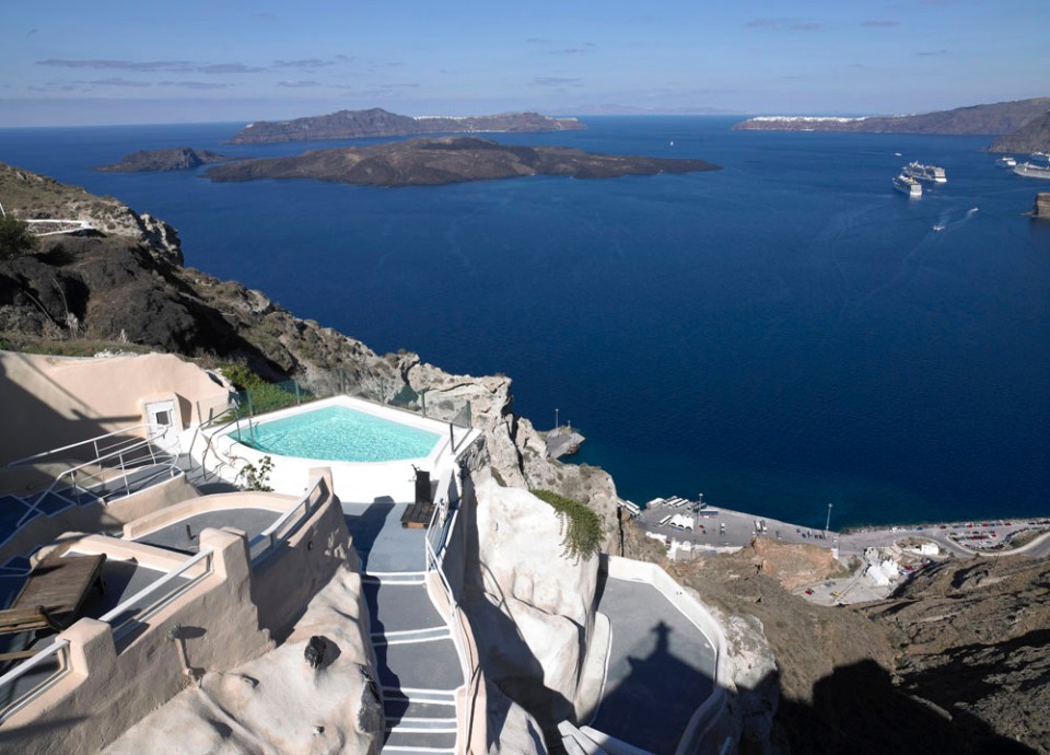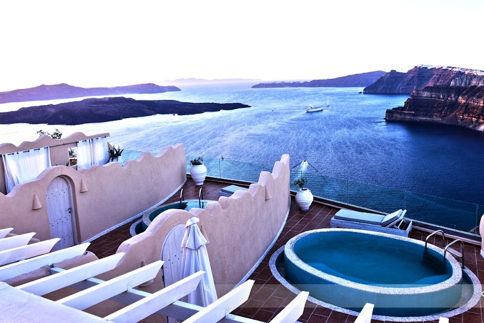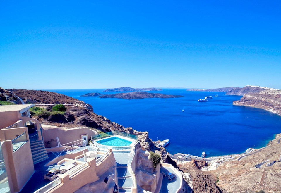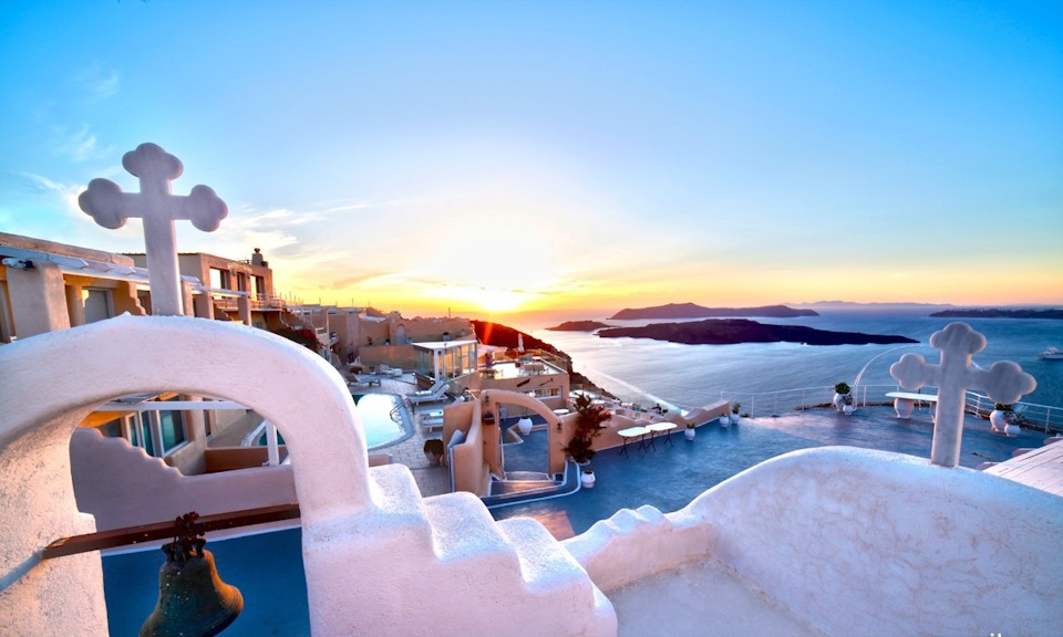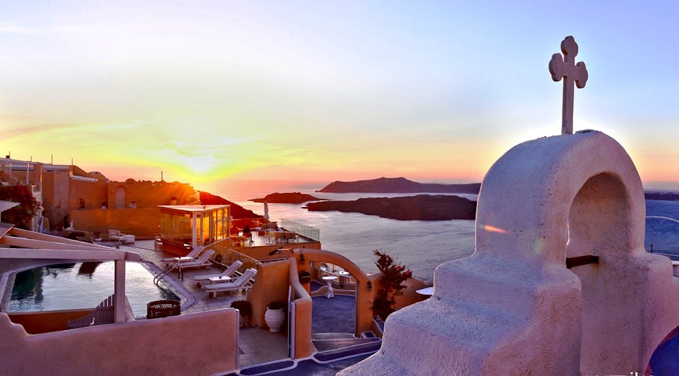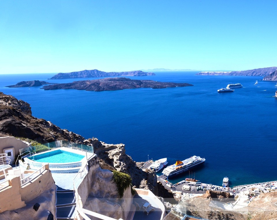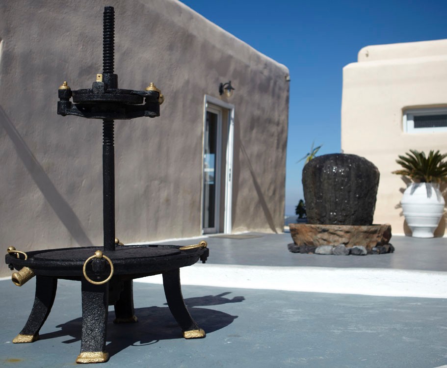 Suites of the Gods is located at the village of Megalohori, 350,00 meters above Athinios Seaport, overlooking the caldera, the legendary volcano and the islands glorious sunset. It is situated 6kms away from the international airport of Santorini and 4kms from the capital of the island, Fira.
