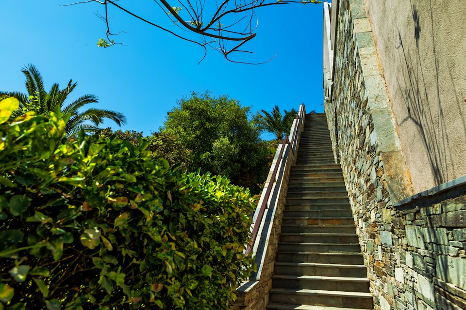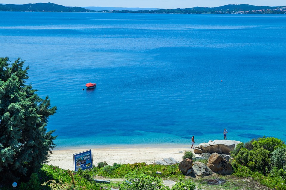 It combines the blue sea overlooking the island of Ammouliani and green woodland that surrounds it.