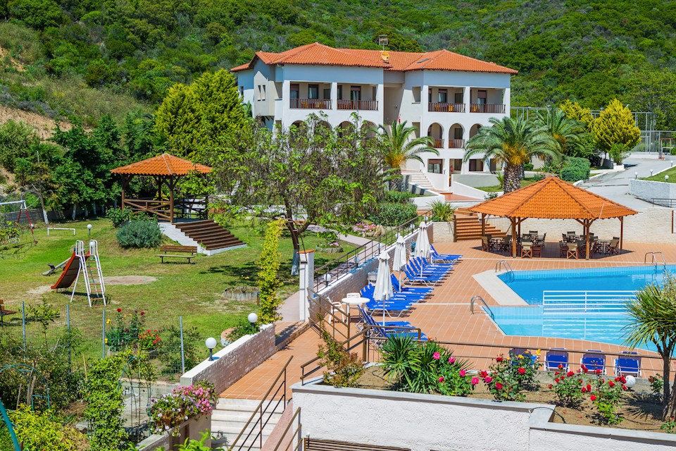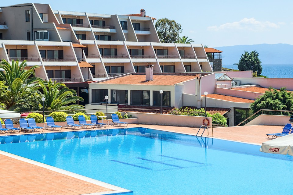 The hotel complex Theoxenia Hotel, located two kilometers from Ouranoupoli Halkidiki, the peninsula of Mount Athos, near the Holy Mountain front in the blue Aegean.