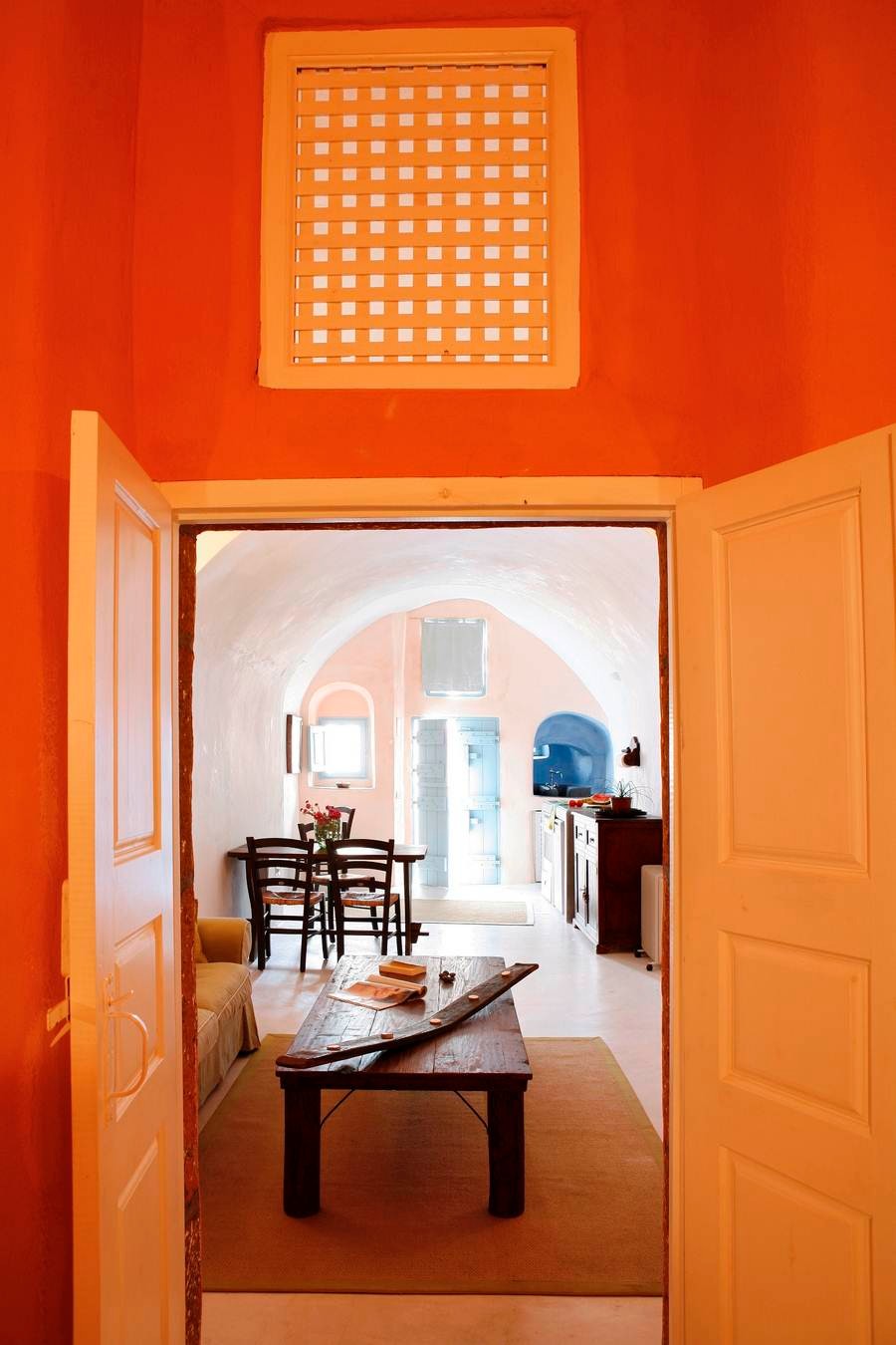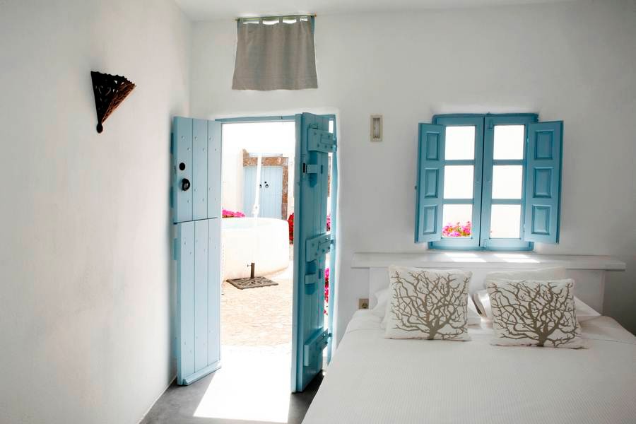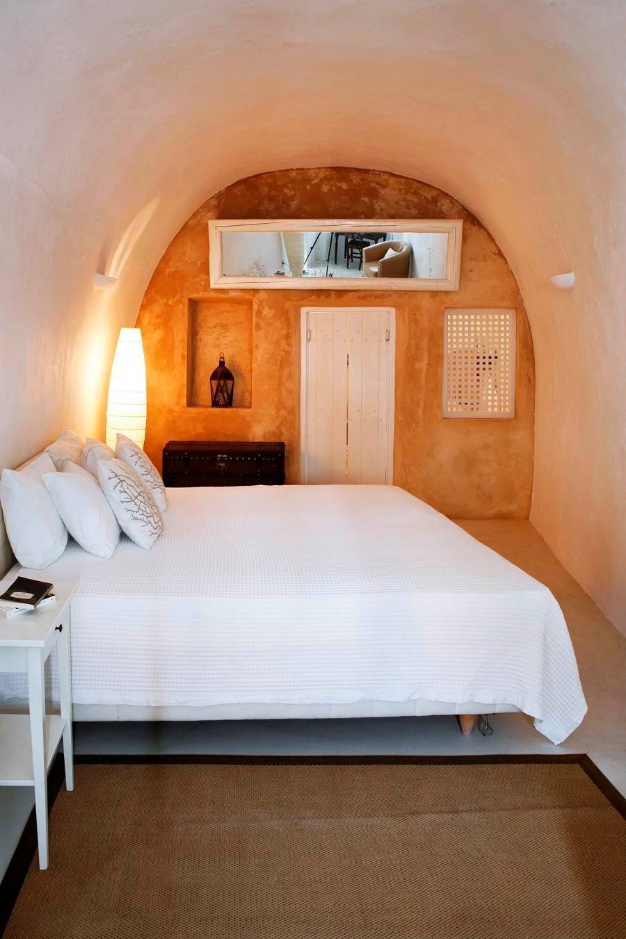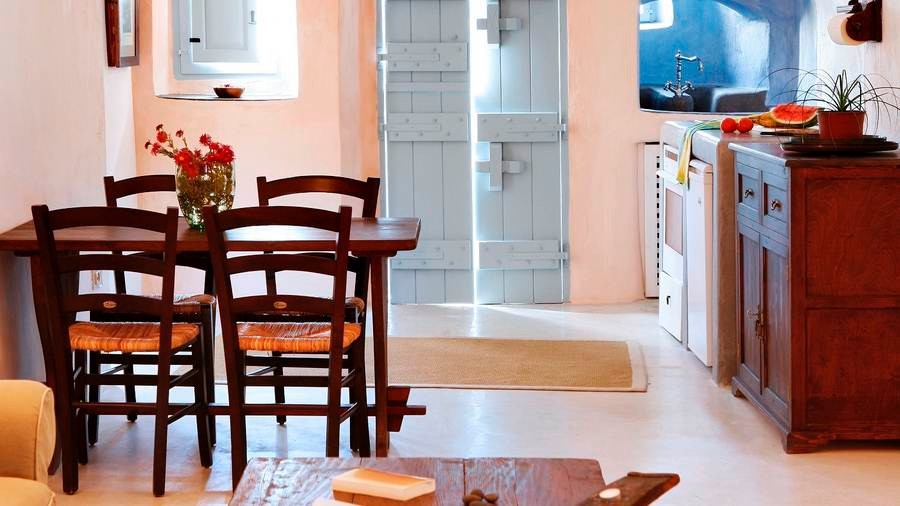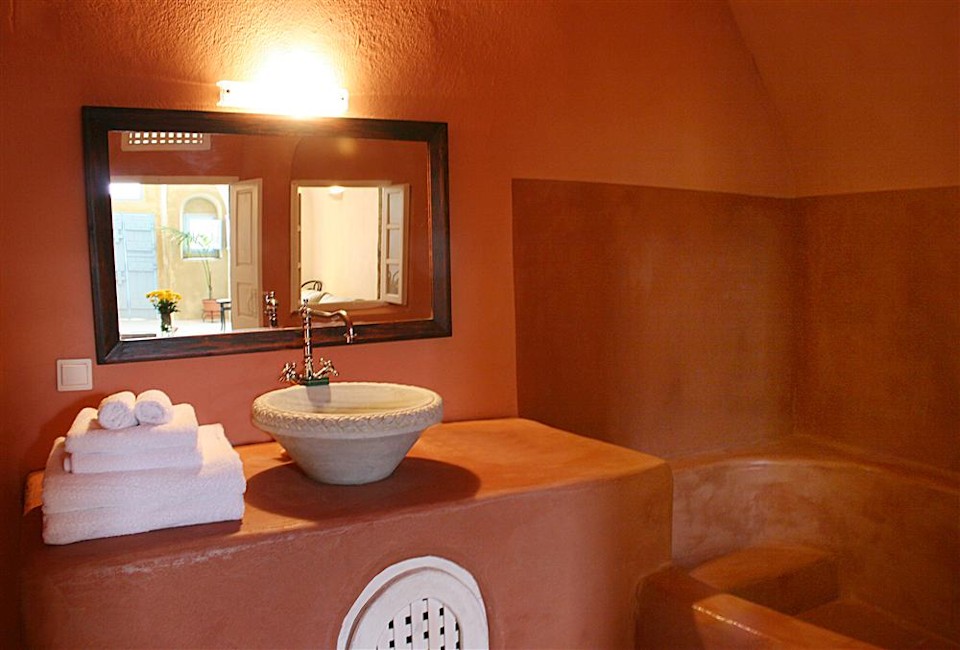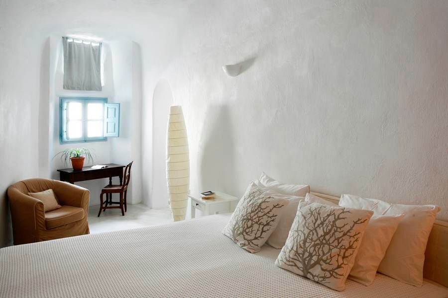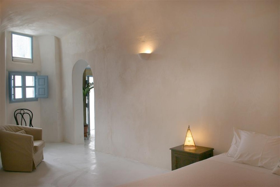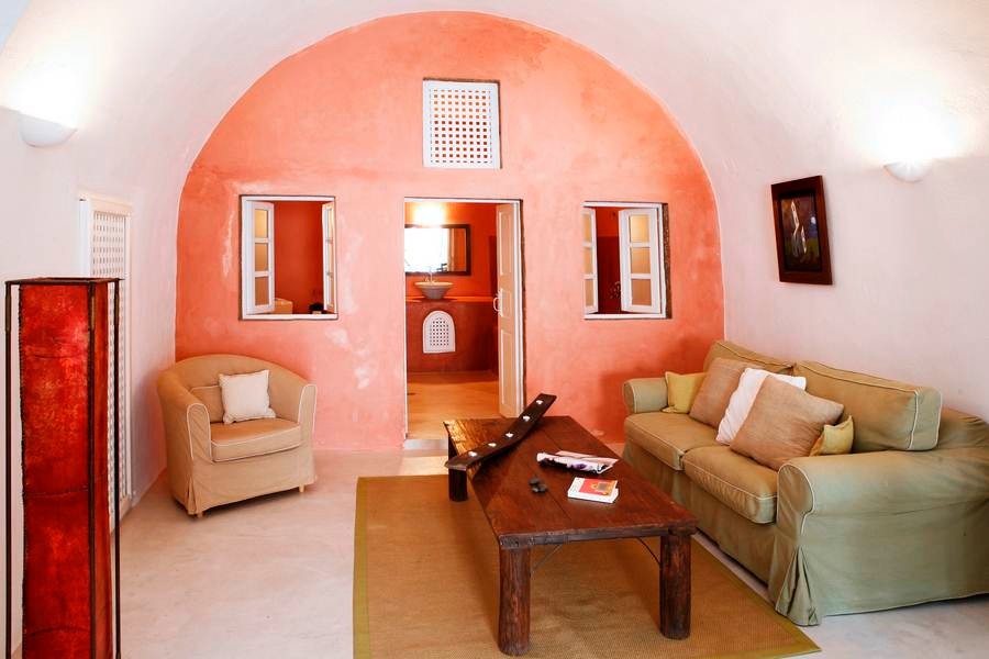 The cool, vaulted interiors throughout the villa give a feeling of relaxation and accentuate the earthy energy of the island. The Santorini - Theraic earth has insulating qualities and has proven to be an early example of bioclimatic architecture, keeping rock-hewn houses cool in the summer and warm in the winter.