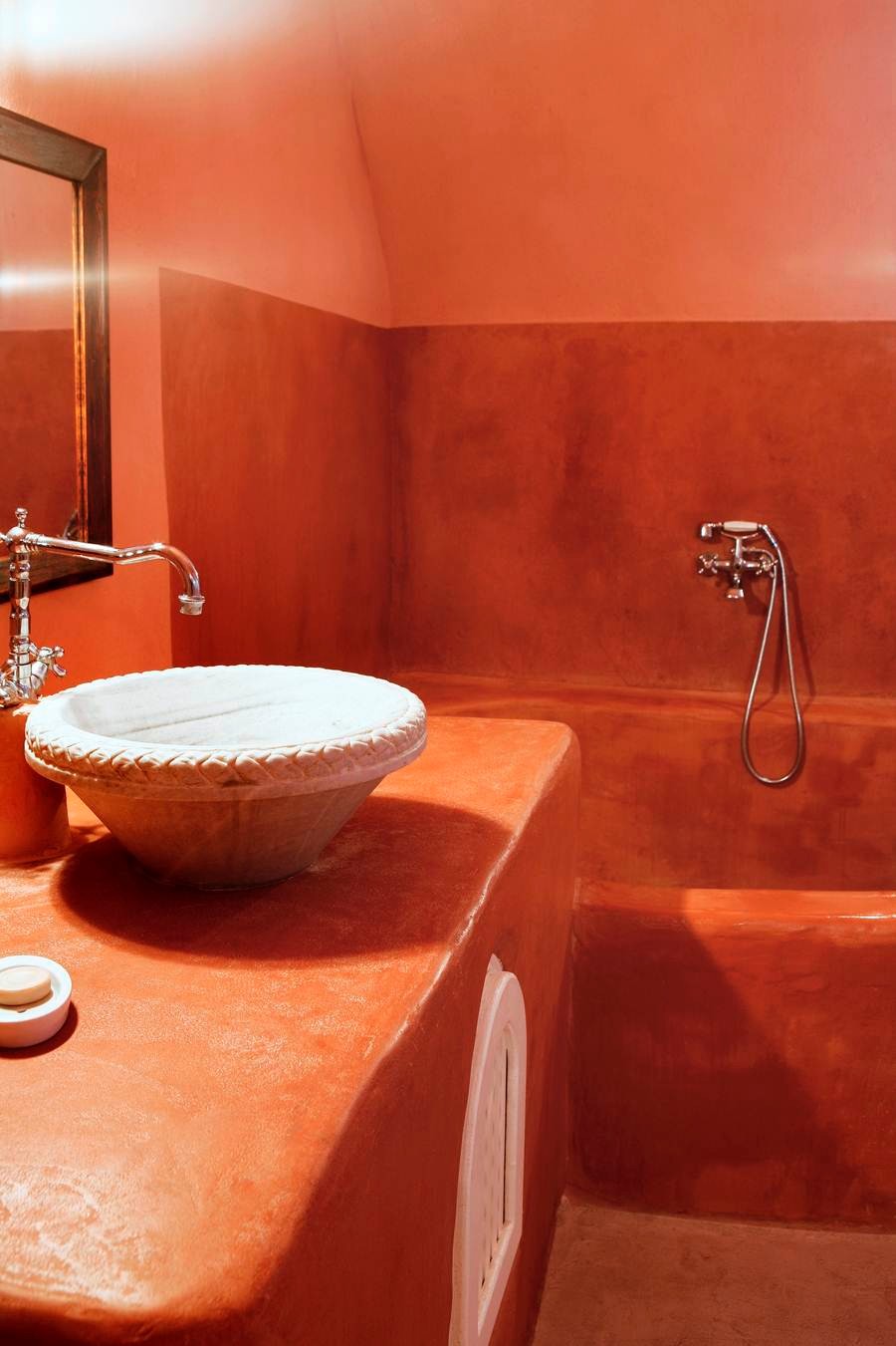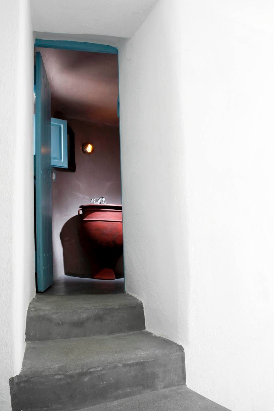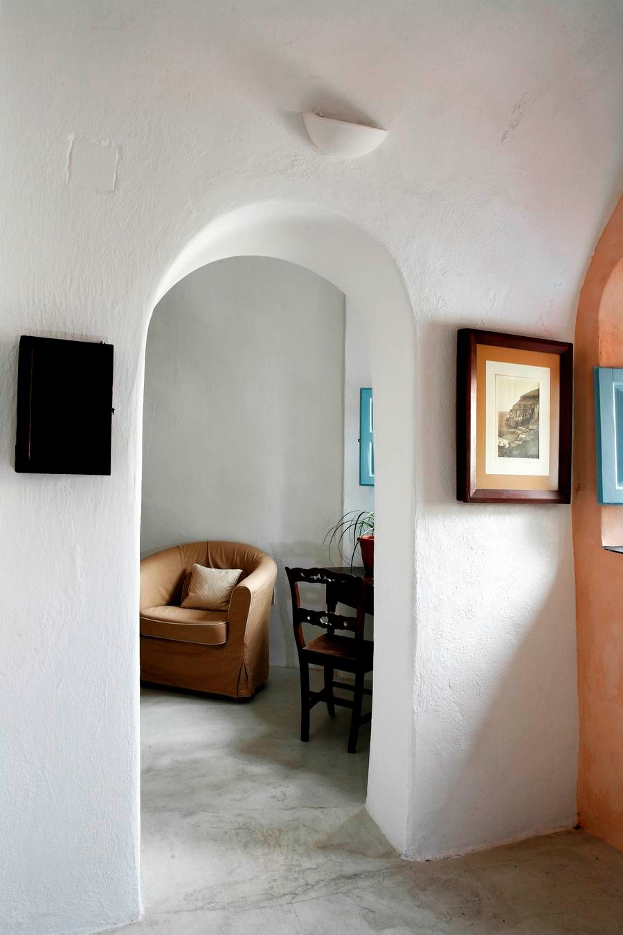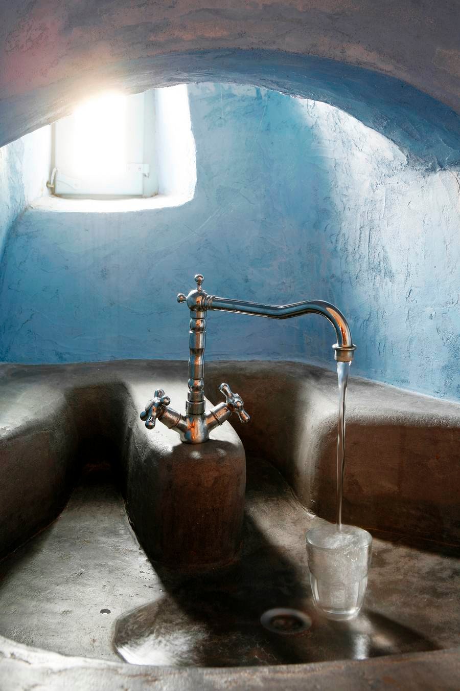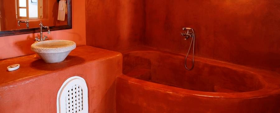 The cool, vaulted interiors throughout the villa give a feeling of relaxation and accentuate the earthy energy of the island. The Santorini - Theraic earth has insulating qualities and has proven to be an early example of bioclimatic architecture, keeping rock-hewn houses cool in the summer and warm in the winter.